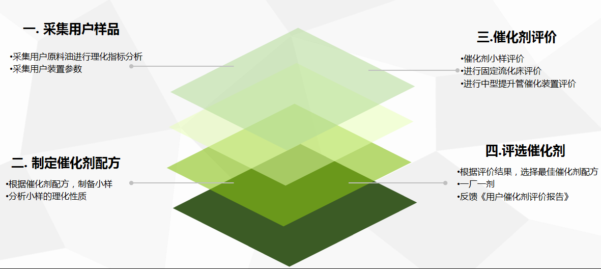 銷售人員負(fù)責(zé)售前采集客戶生產(chǎn)工藝數(shù)據(jù)、原料油樣品等,然后交由技術(shù)服務(wù)中心分析,研發(fā)部根據(jù)分析結(jié)果制備催化劑小樣,通過重油微反實(shí)驗(yàn)裝置、固定流化床實(shí)驗(yàn)裝置和中型提升管催化裂化裝置,對催化劑配方篩選和工藝效果實(shí)施三級(jí)評(píng)價(jià),根據(jù)評(píng)價(jià)結(jié)果靈活調(diào)整催化劑配方重復(fù)試驗(yàn)并選定最優(yōu)方案交由生產(chǎn)管理部實(shí)施定制化生產(chǎn)。